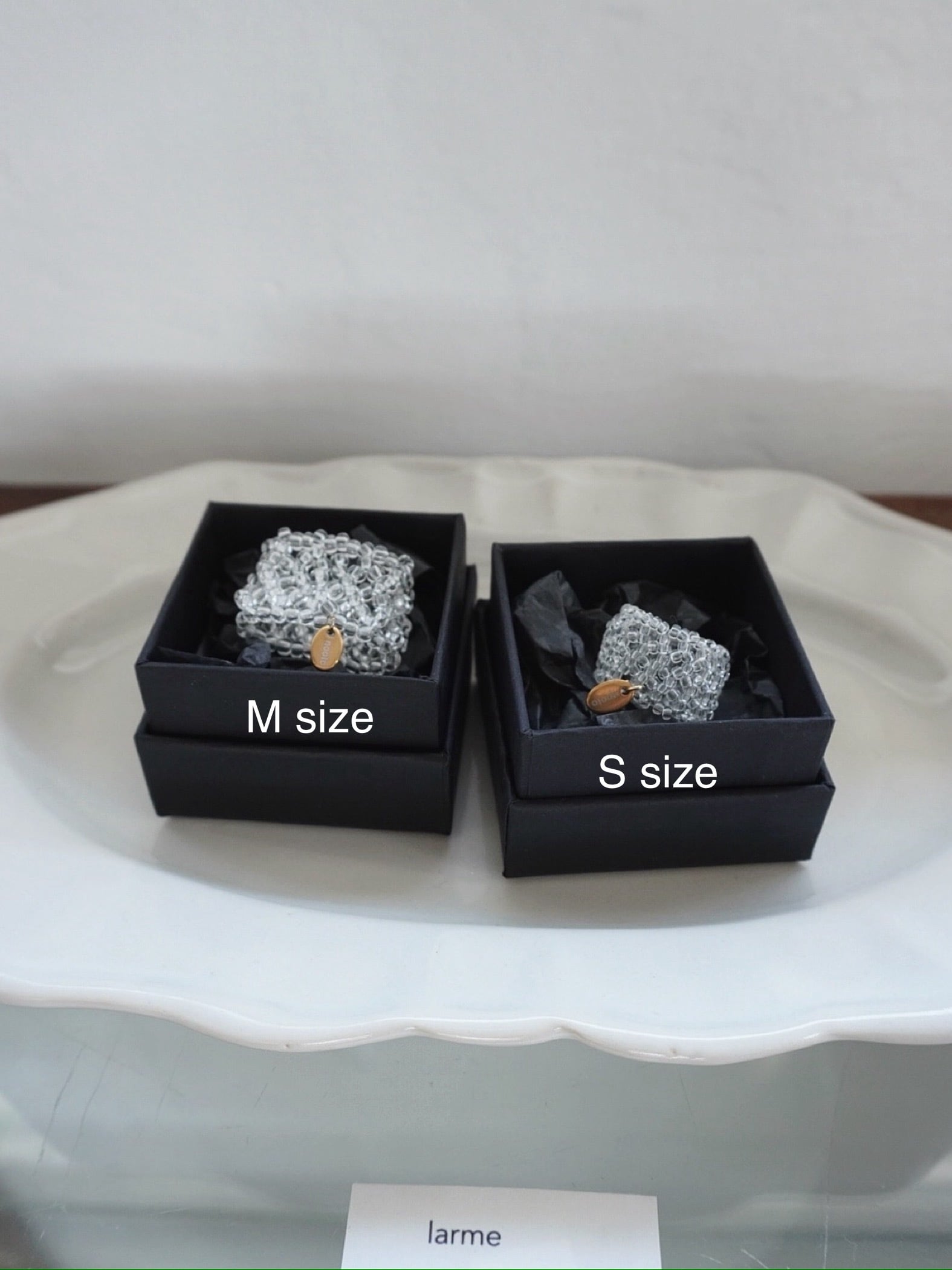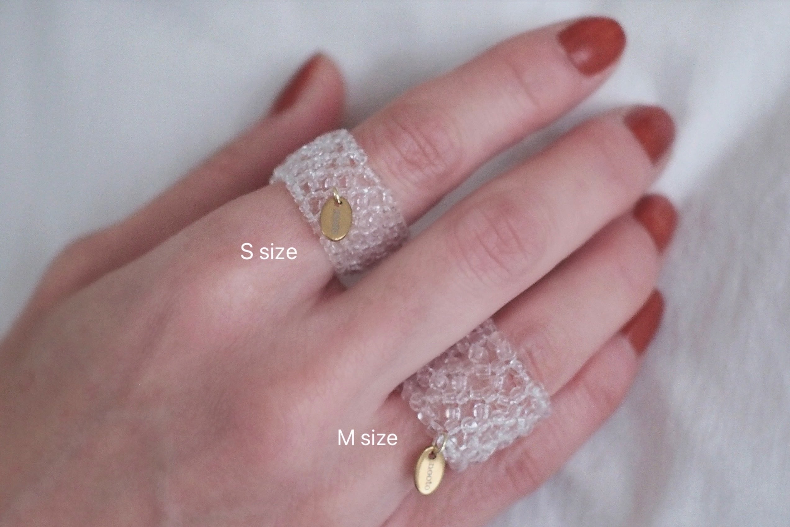 Mサイズは存在感がありコーディネートの主役にもなり、Sサイズは普段のアクセサリーと重ね付けしていただいても邪魔にならない感じです。