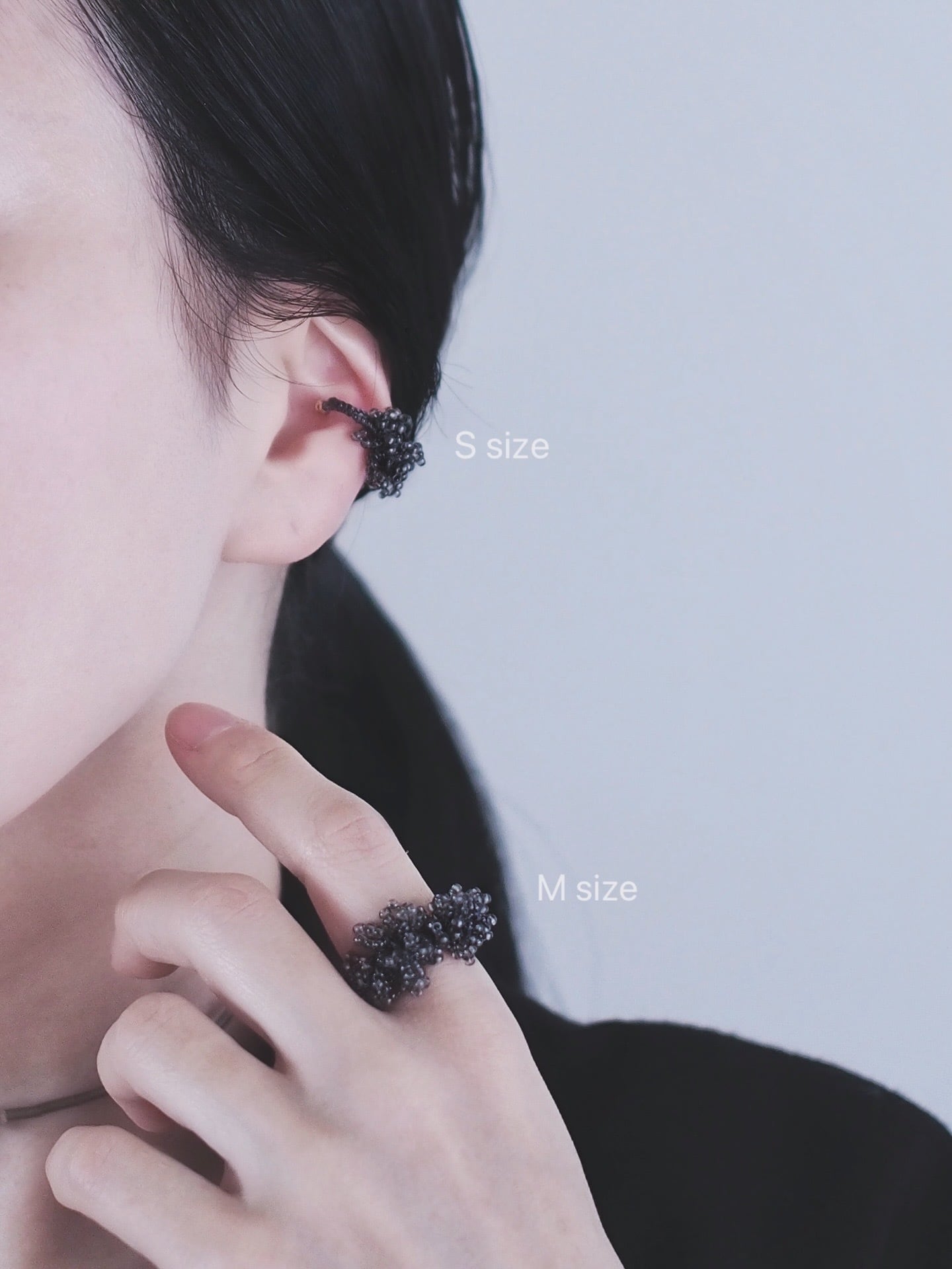 ガラスビーズを編み込んだイヤカフ兼リング。