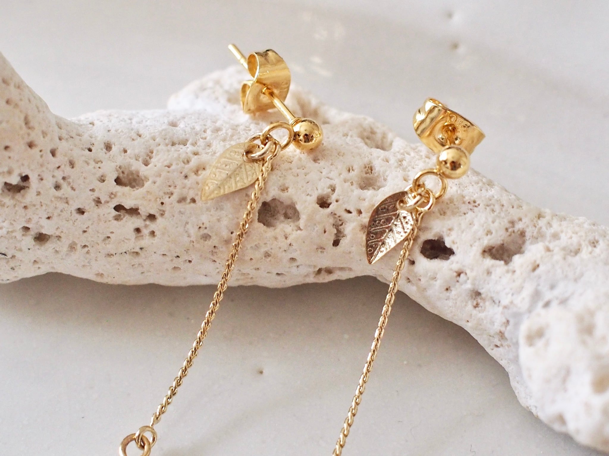 イヤリングは真鍮メッキでニッケルフリー加工をしてあるイヤリング金具です。濡れたままで保管すると色落ちや変色の原因になりますので使用後は汗や皮脂を拭き取り、直射日光を避けて保管してください。